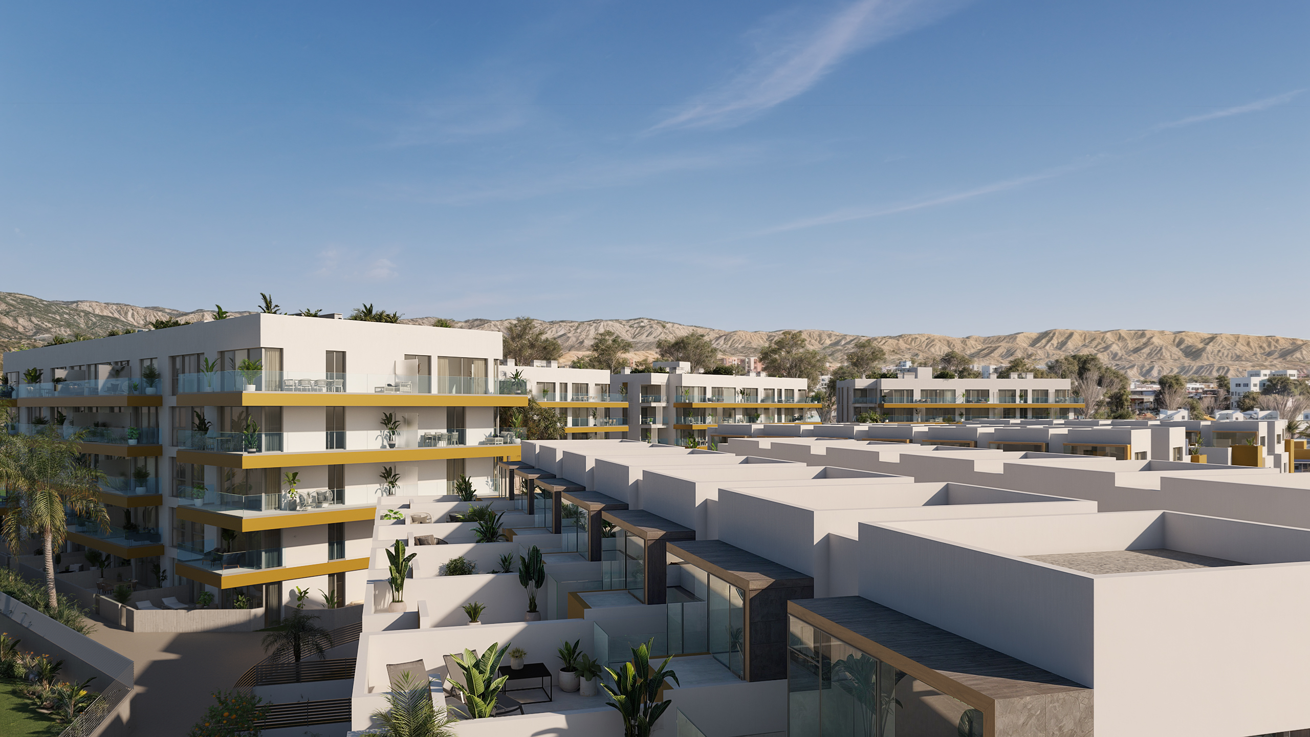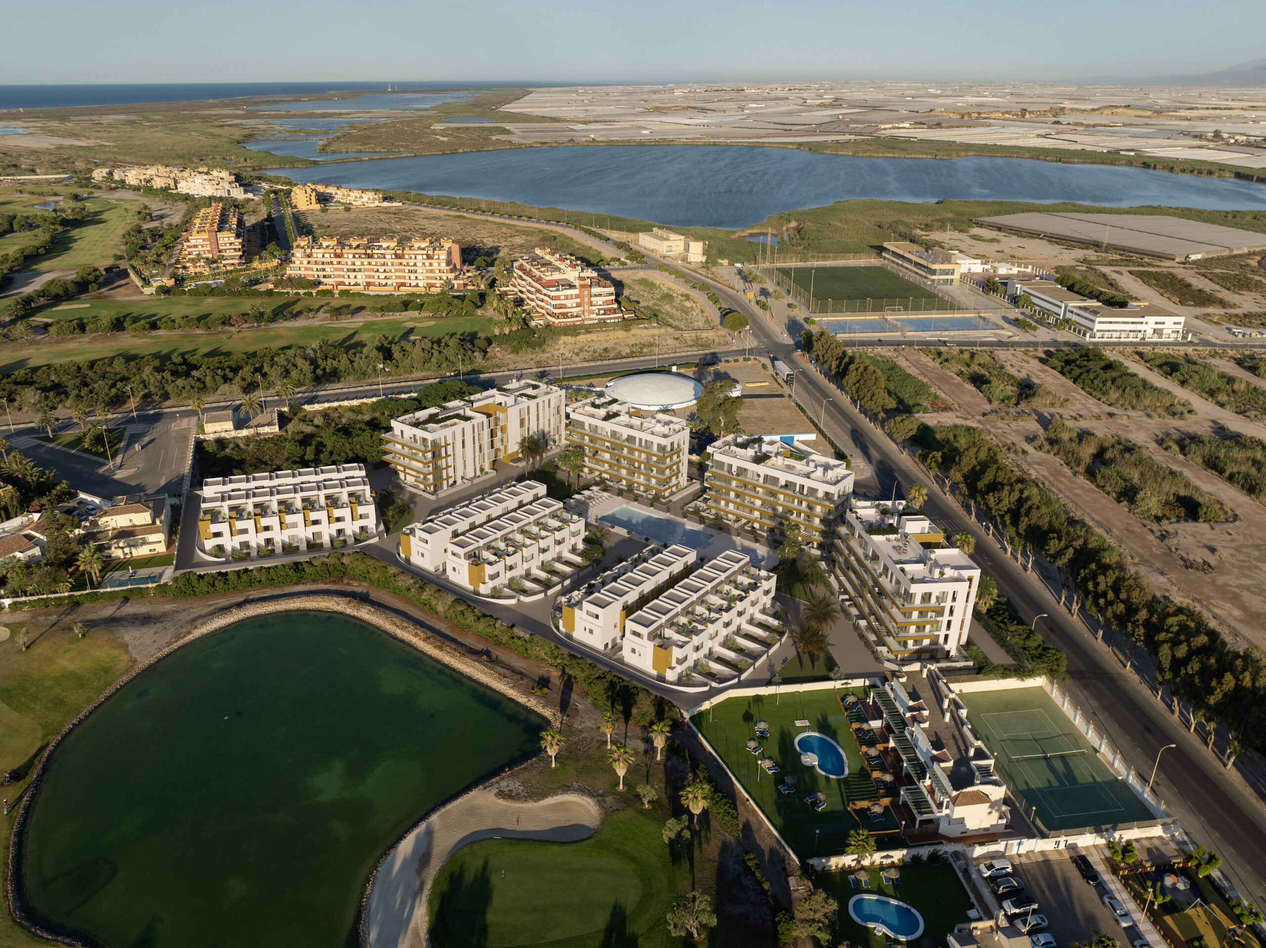 Residencial compuesto por viviendas de distintas tipologías, con piscina y amplias zonas de uso común. Integrado por cuatro bloques en plurifamiliar, con 116 viviendas de 1, 2 y 3 dormitorios con garaje. Las superficies van desde los 54 a los 129 M2. Completan la promoción 40 viviendas unifamiliares distribuidas en tres alturas con una superficie media de 198 M2 y amplias terrazas de uso privado. Compagina todas las comodidades que se pueden esperar de un diseño adaptado a las nuevas demandas del mercado, con la proximidad a la playa y vistas al campo de golf . Todo ello a escasa distancia del enclave natural de las Salinas Viejas. La variedad de tipologías y la mejora en el acceso que ha supuesto la puesta en funcionamiento de la Variante A-1051 que enlaza Roquetas y Vicar con la autovía A7, supone poder residir en este entorno privilegiado con un cómodo acceso a todos los servicios y principales vías de comunicación. Una oportunidad única para invertir en una de las zonas mas pujantes de Roquetas.